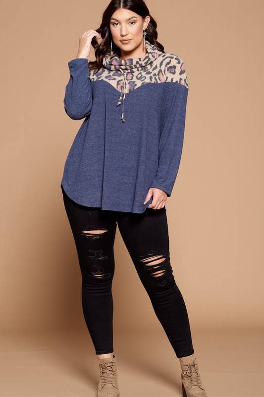 Plus Size Solid Hacci Brush Funnel Neck Pullover with Ribbed Brush Animal Print Contrast and Drawstrings