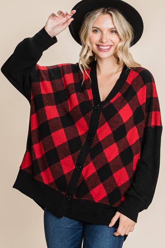 This winter staple features a buffalo plaid print, knit fabric, and oversized fit.